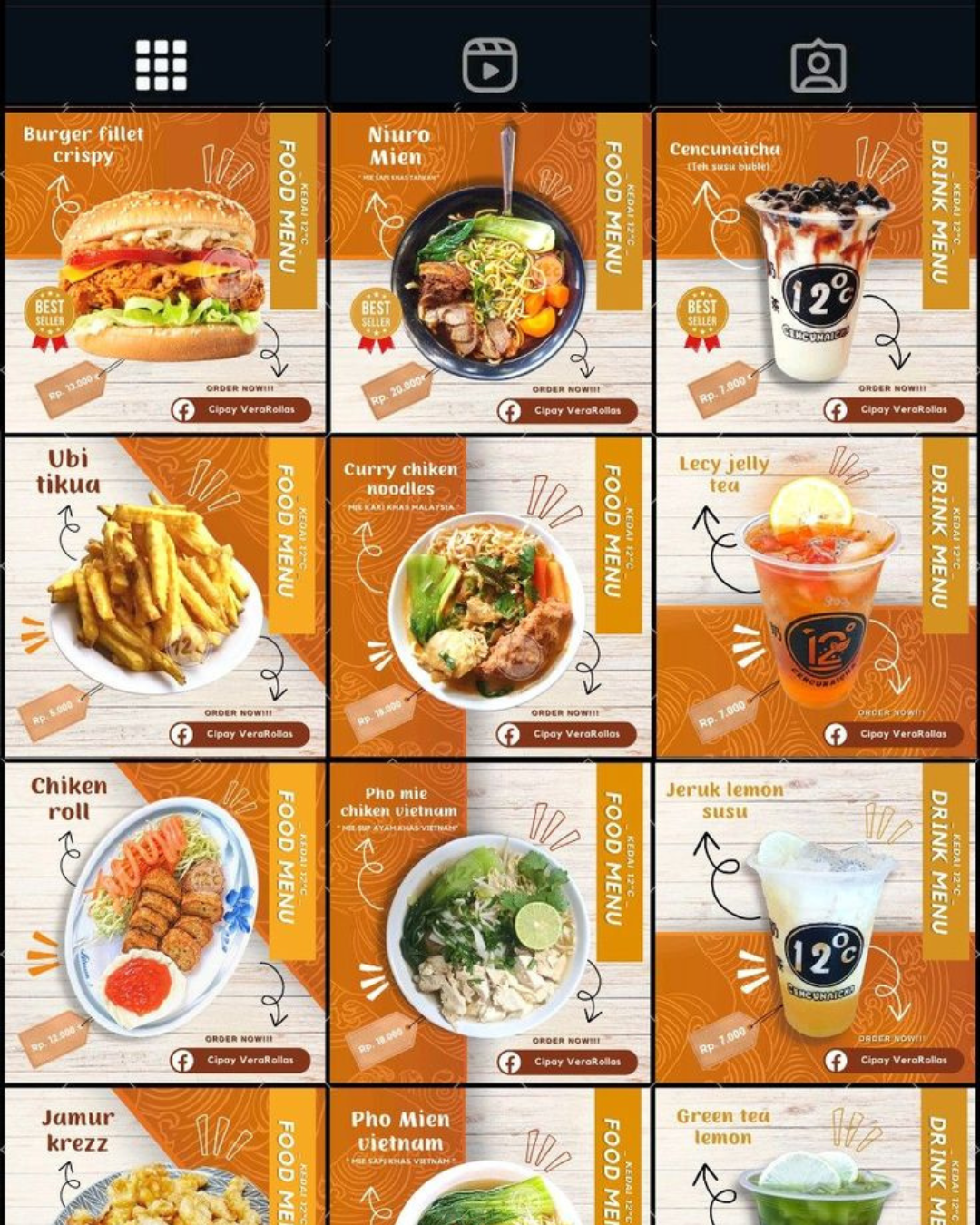 "Melalui layanan branding visual dan manajemen konten KulinaRise, desain feed ini menampilkan menu makanan dan minuman secara profesional dan menarik"